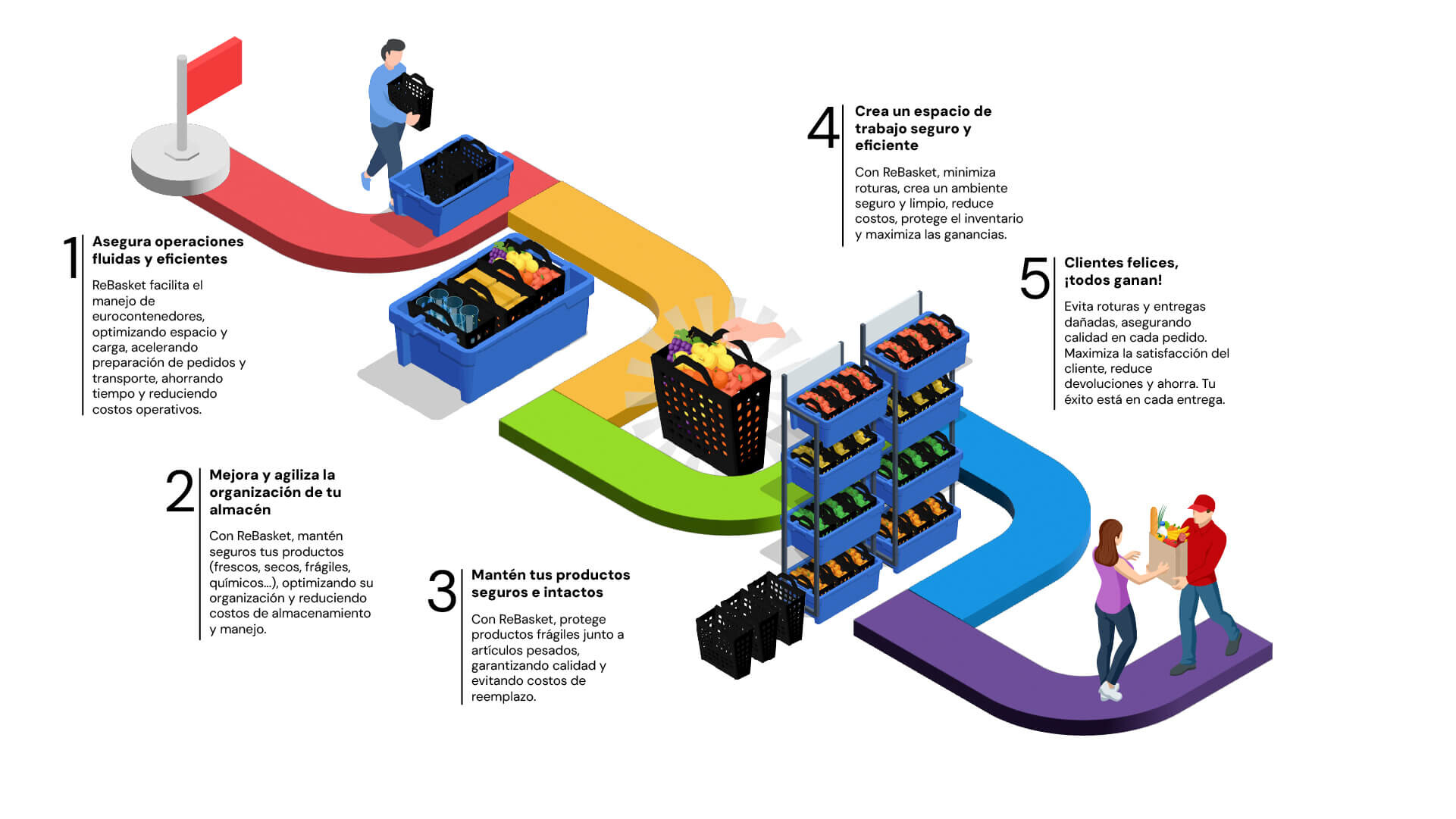 Tres unidades de ReBasket caben dentro de un eurocontainer de 400 x 600 mm y 340 mm de altura.